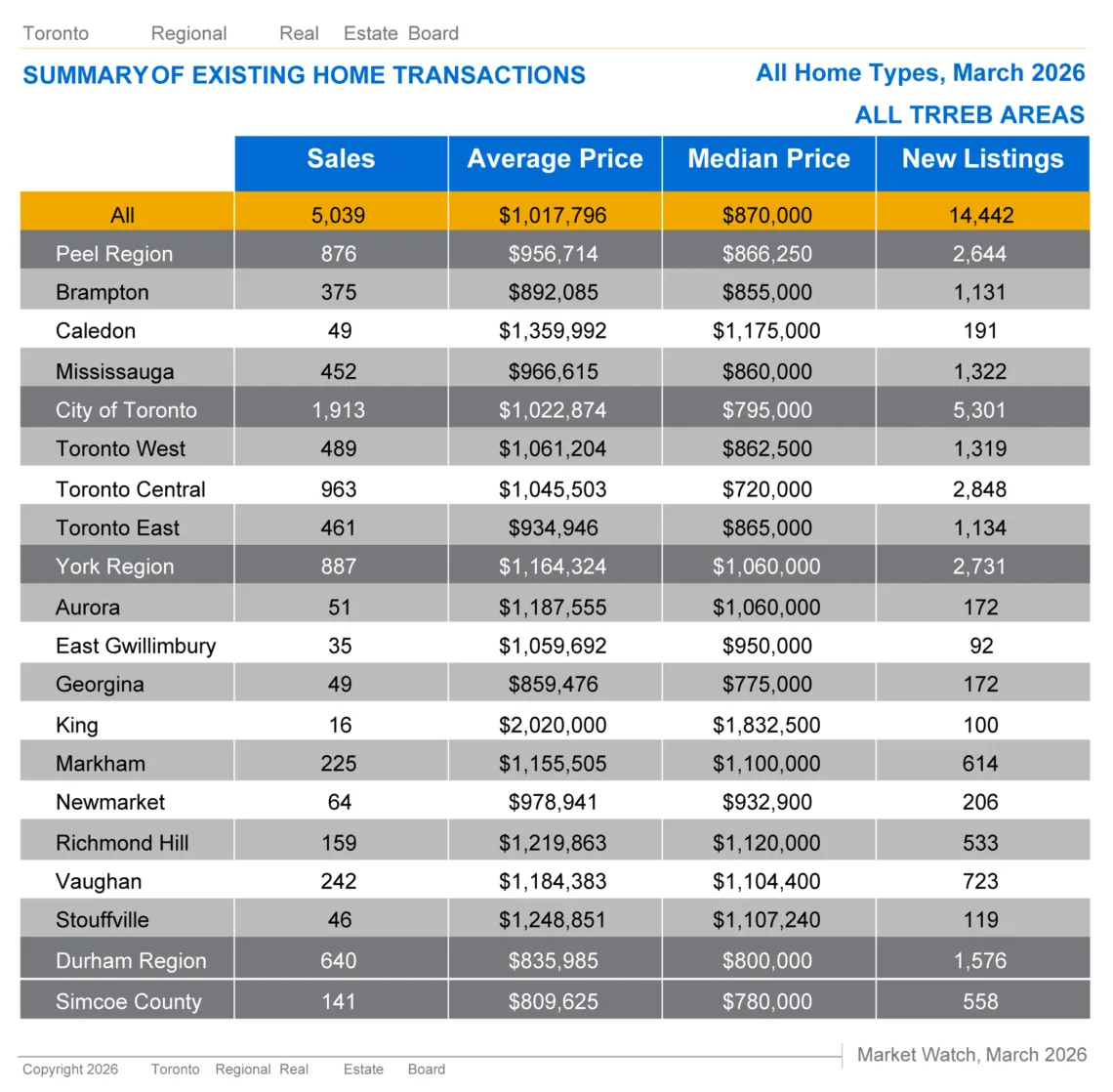 • York Region: 887 sales with an average price of $1,164,324
